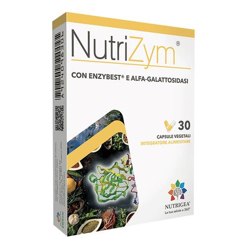 NutriZymDescrizione Integratore alimentare a base di enzimi da maltodestrine fermentate ed estratti vegetali con Alfa-Galattosidasi. Grazie alla presenza dell'estratto di Cardo mariano supportato da radice di Tarassaco è in grado di favorire la funzione digestiva ed epatica e un adeguato metabolismo dei carboidrati. Ingredienti EnzyBest (enzimi da maltodestrine fermentate), Cardo mariano ( Silybum marianum L. Gaertn.) frutti estratto secco (80% silimarina, 30% silibina e isosilibina), Tarassaco ( Taraxacum officinale D.C. Web.) radice, microalghe Klamath RW max ( Aphanizomenon flos aquae), gomma d'Acacia, Alfa-Galattosidasi, Patat...